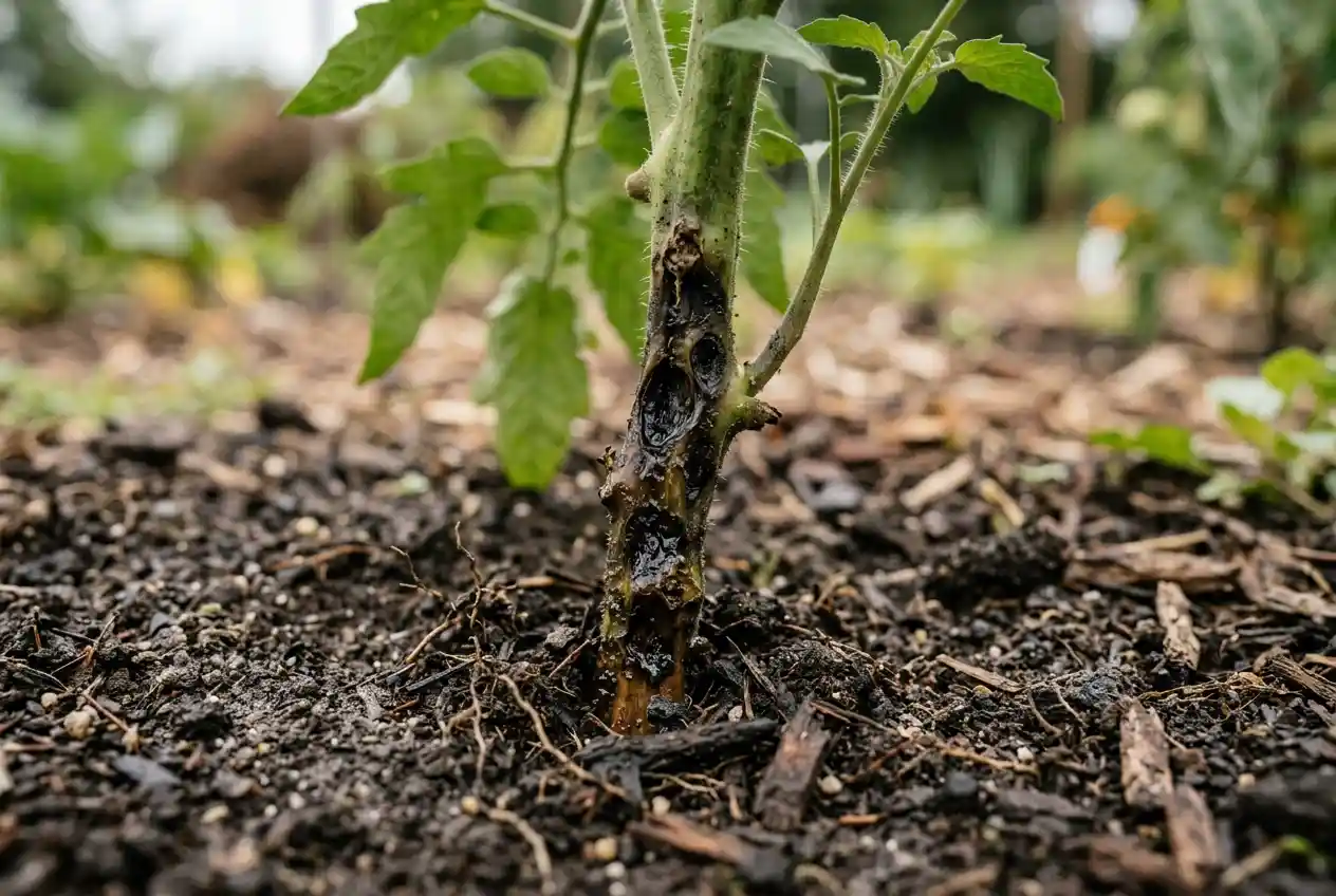 Du stehst vor deinen Tomatenpflanzen und siehst schwarze, eingesunkene Flecken am Stängel, kurz über der Erde. Die Blätter darüber hängen schlaff, obwohl du regelmäßig gegossen hast. Was zunächst wie ein lokales Problem aussieht, ist in Wirklichkeit ein Angriff auf die Lebensader der Pflanze. Stängelfäule ist eine der hinterhältigsten Tomatenkrankheiten, weil sie von unten kommt und oft zu spät erkannt wird.